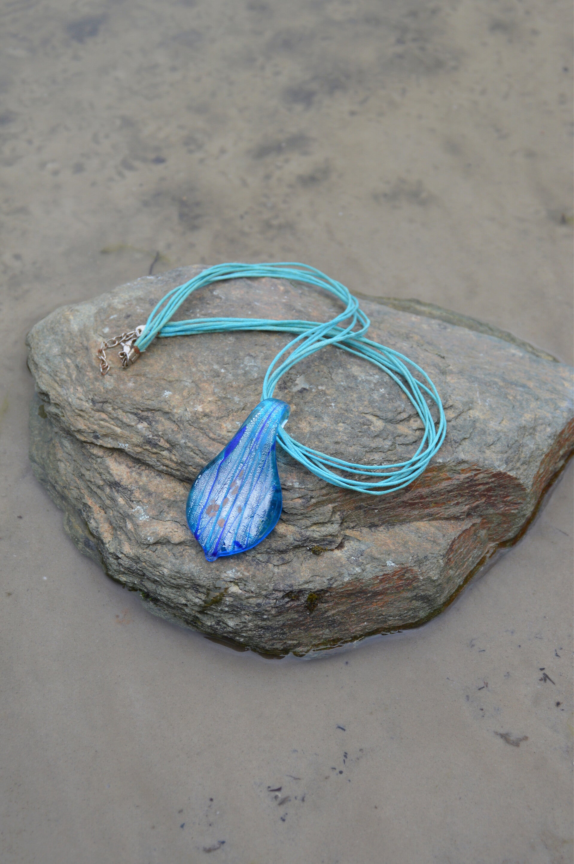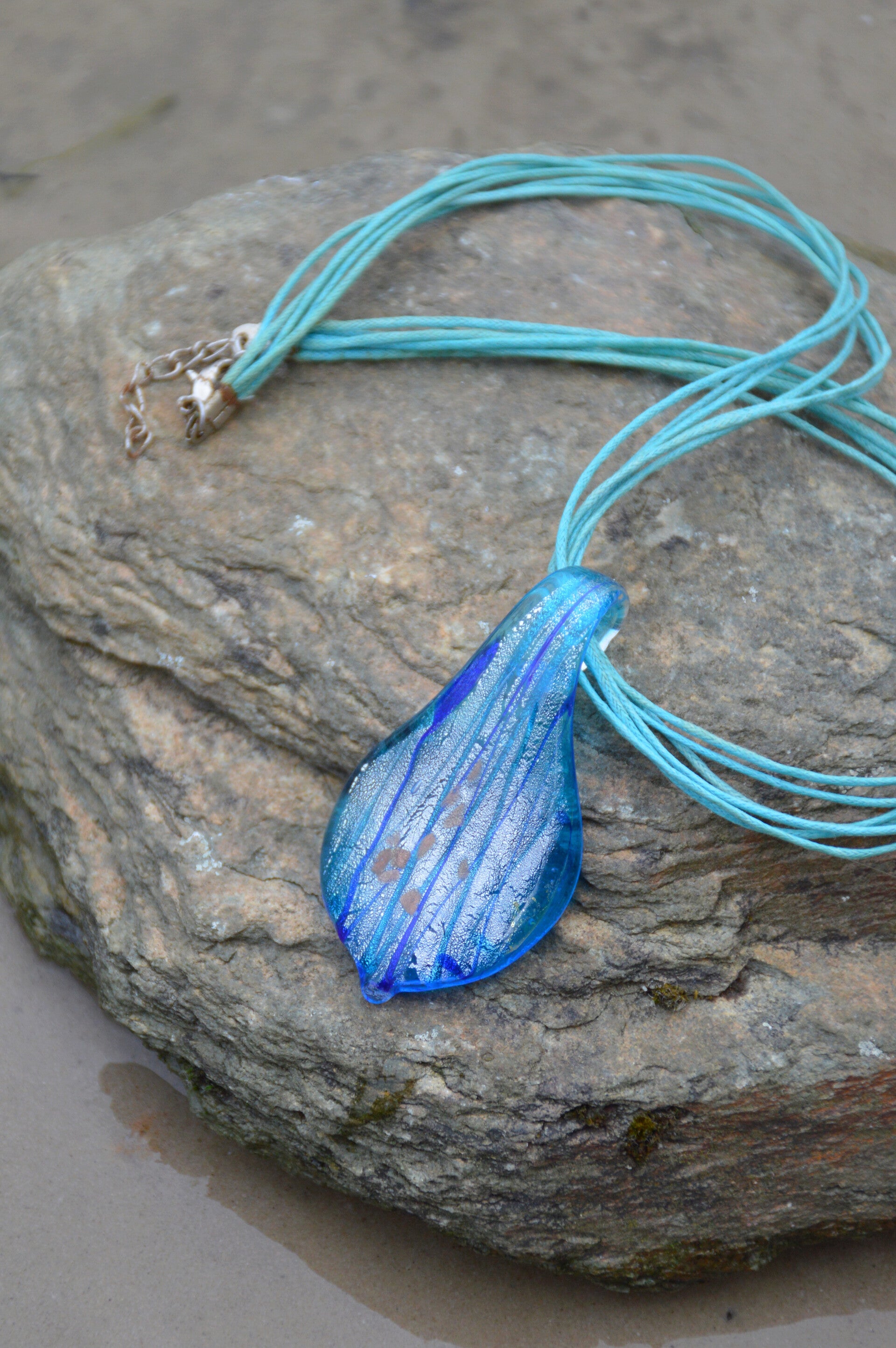 This beautiful murano glass waterdrop necklace has a variation of beautiful blue colors. Perfect to finish up your outfit!