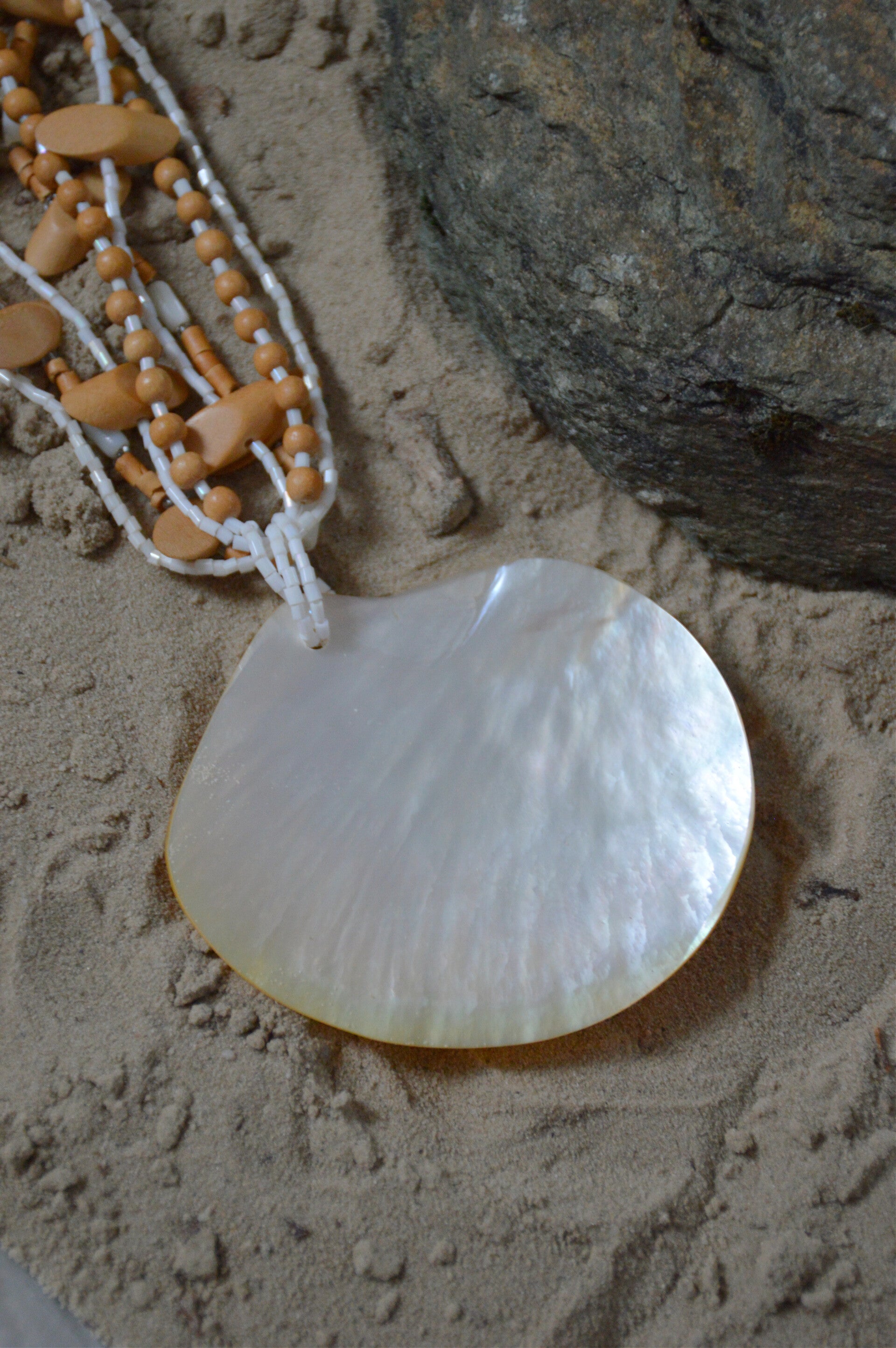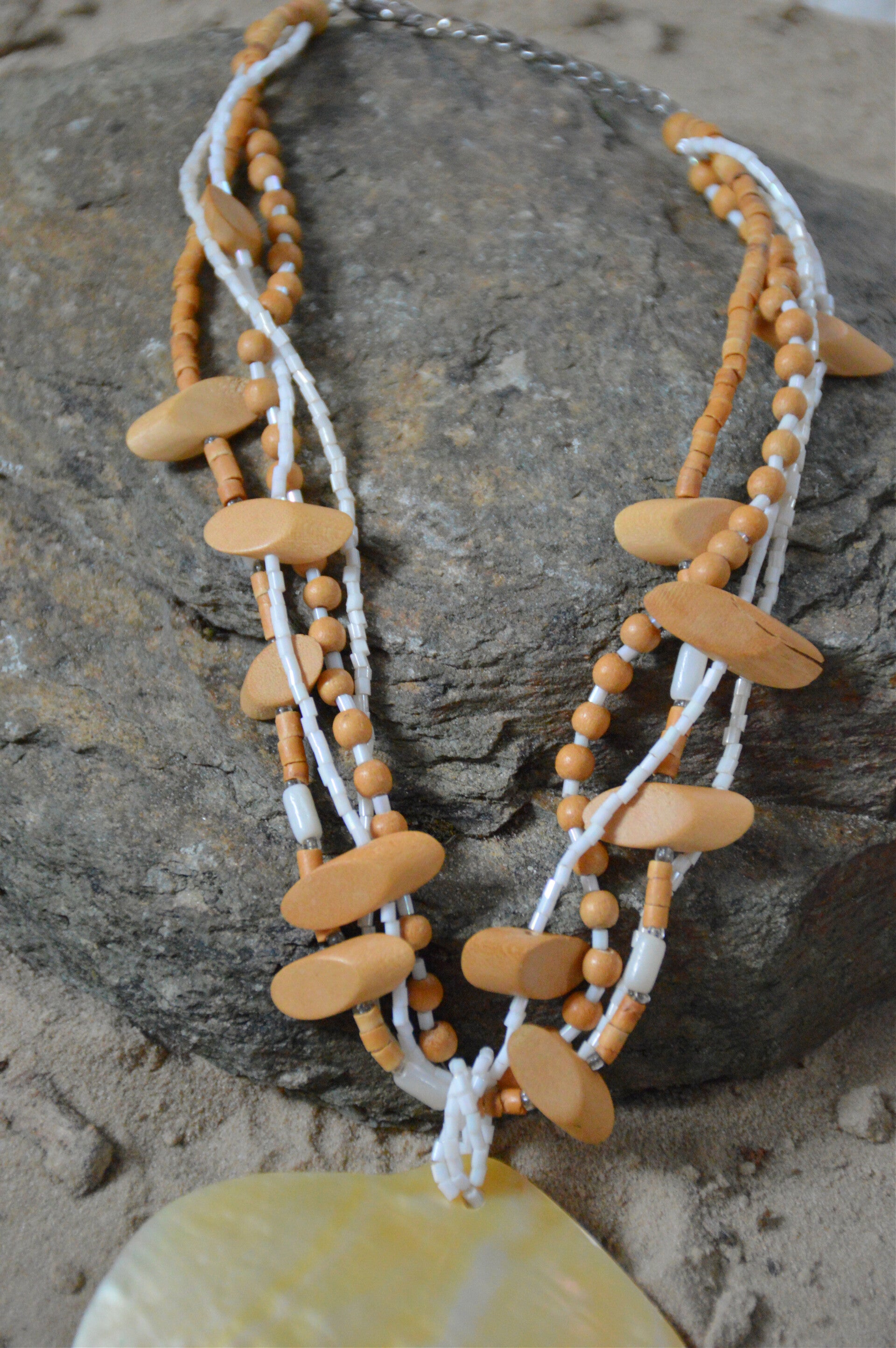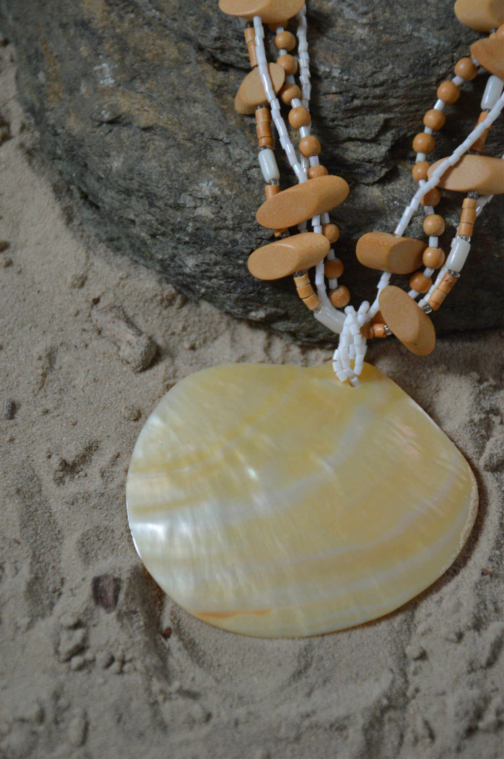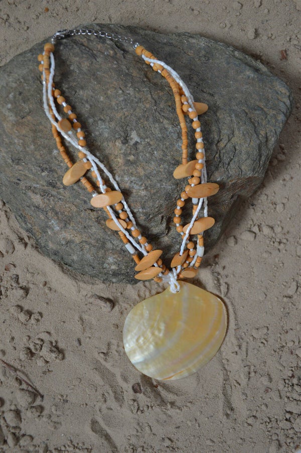 This beautiful necklace is the perfect combination between real wooden beads and a big shell pendant.