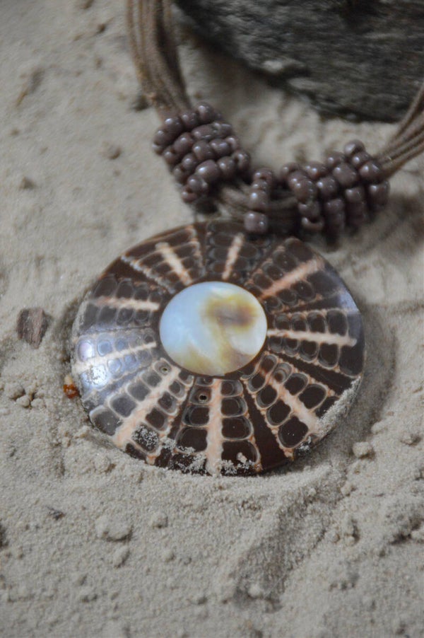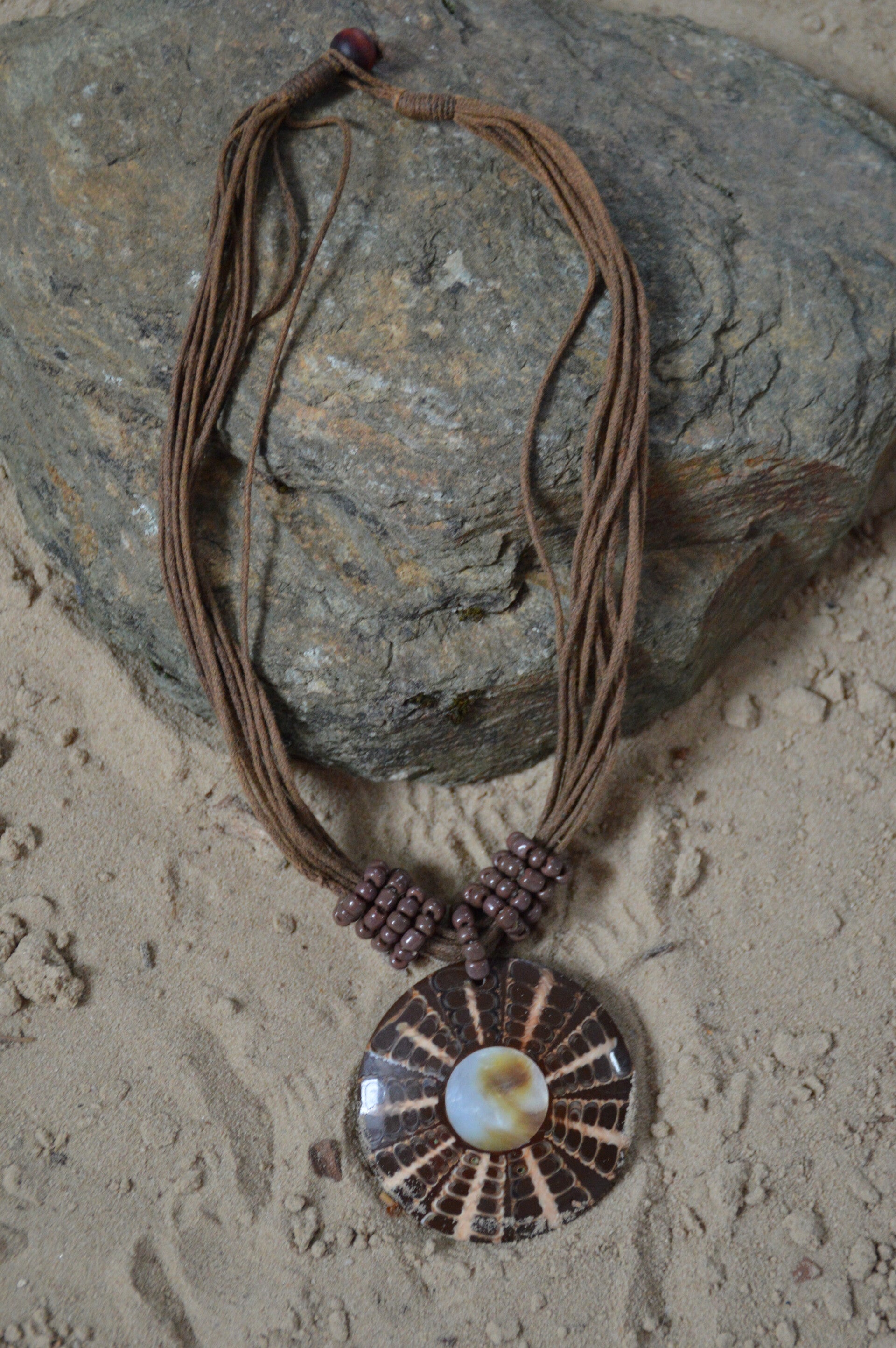 This beautiful necklace with brown straps, brown beads and a shell ammonite pendant is the ultimate dream necklace!