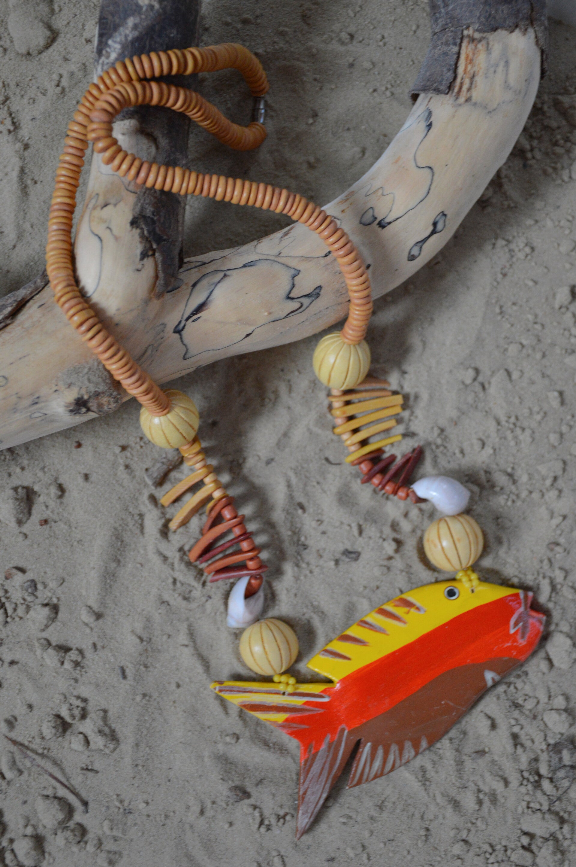 This necklace with wooden beads, shells and a big wooden fish is a real statement piece!