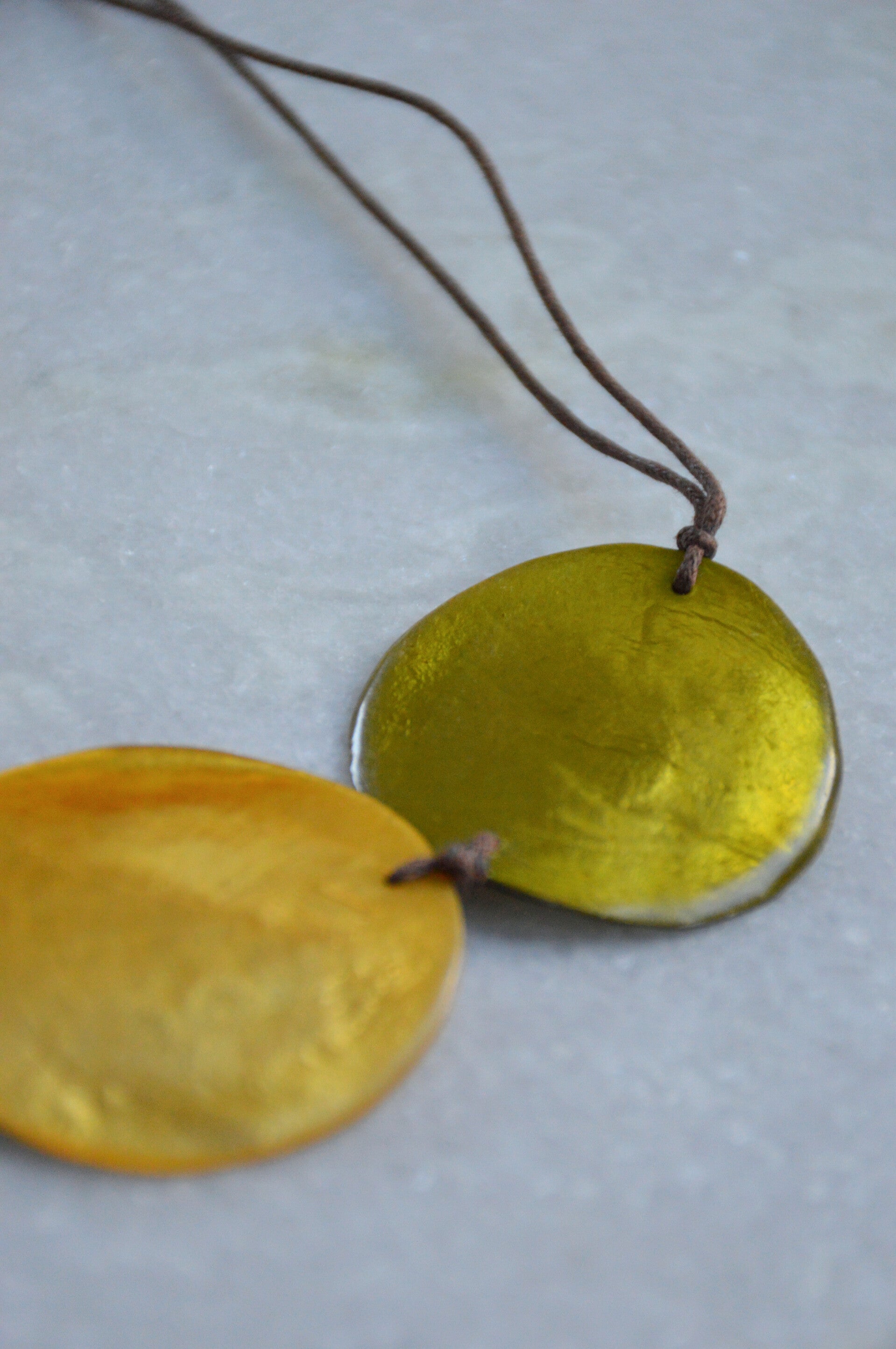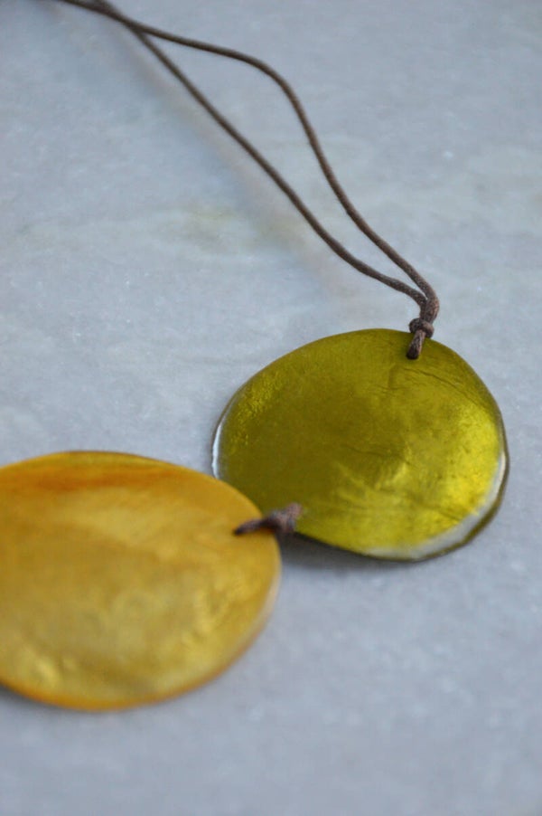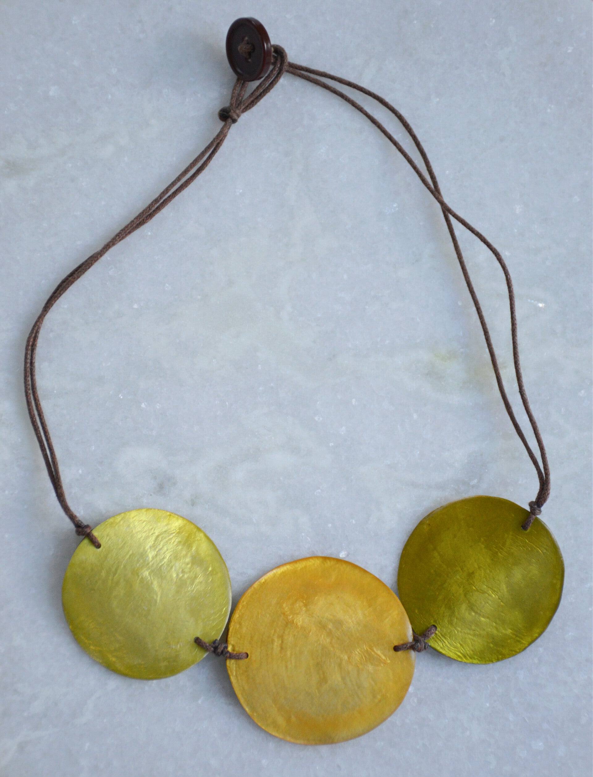 This shell necklace consists of three round shells in yellow and green colors.