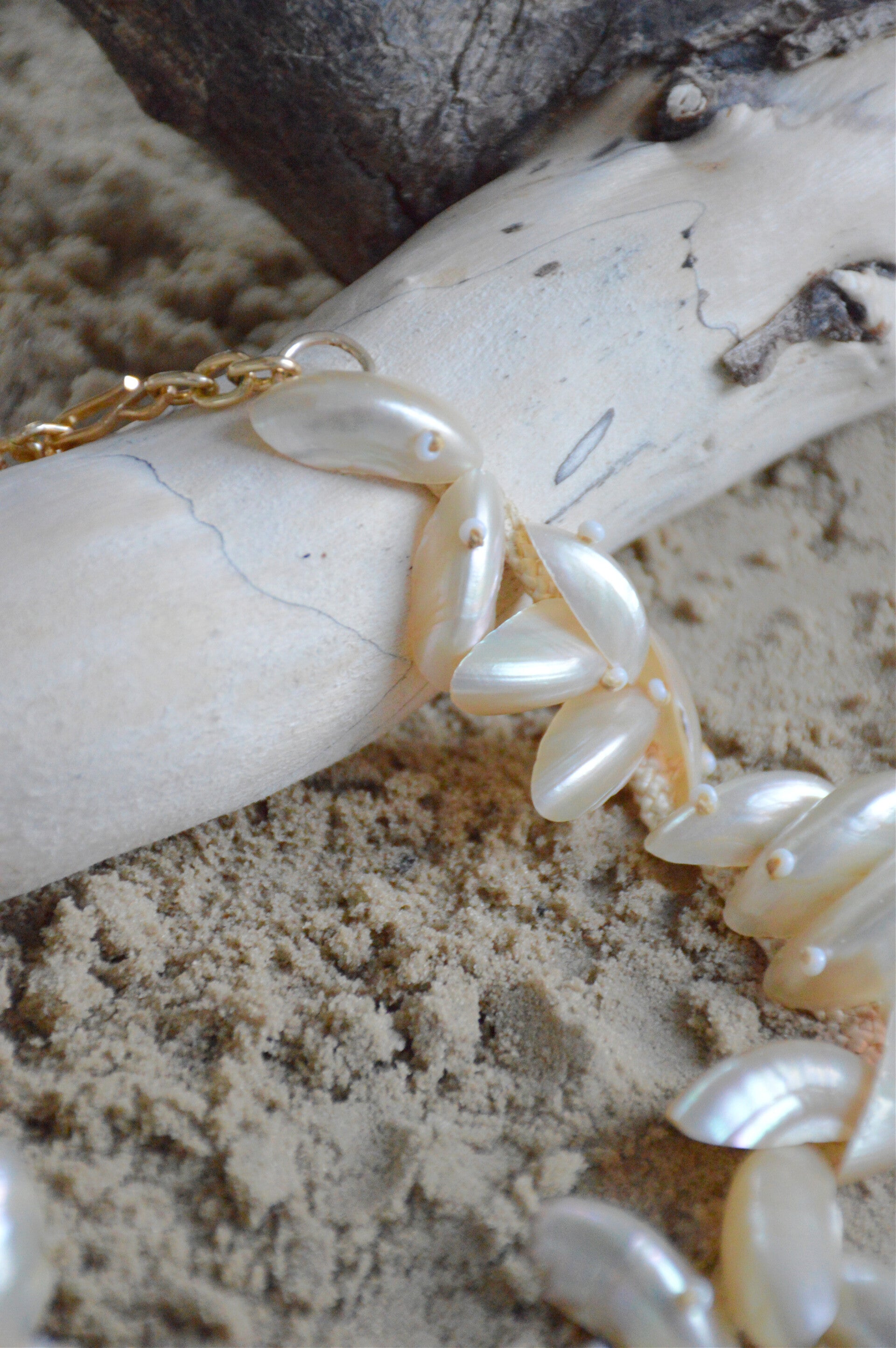 This beautiful and unique shell necklace is a real statement piece! The real shells are tied together with rope and finsihed with a clasp.
